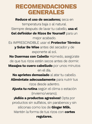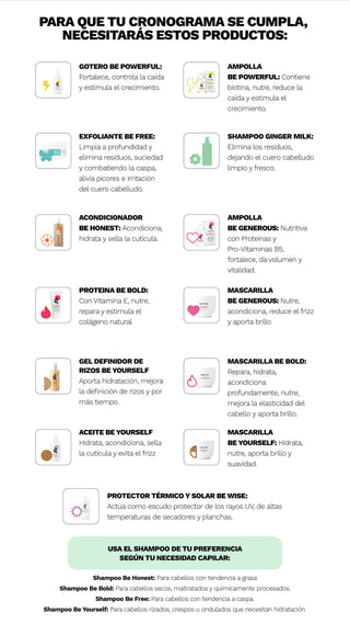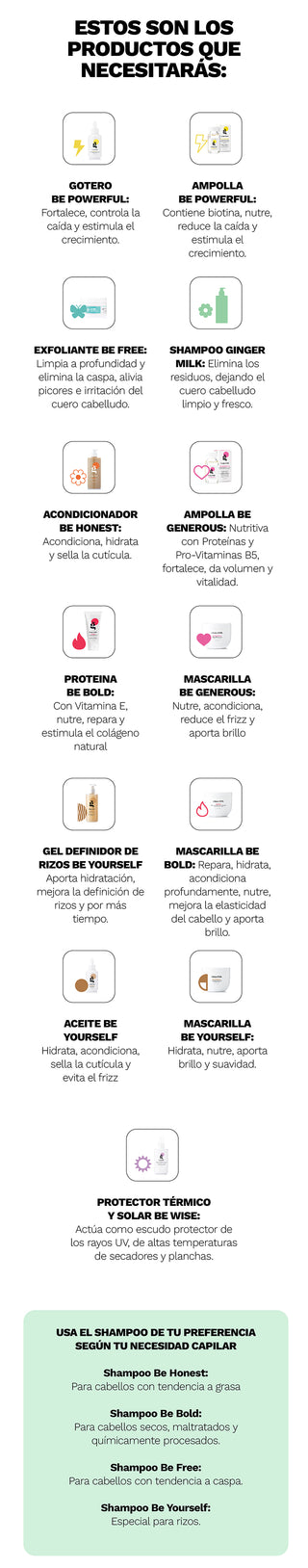 Lavar el cabello con Shampoo Ginger Milk. Seguidamente, usa el Acondicionador Be Honest y retira con agua. Aplica la Mascarilla Be Yourself y lava con suficiente agua. Aplica la Ampolla Be Powerful. Por último, Aceite Be Yourself de medios a puntas y dejar.