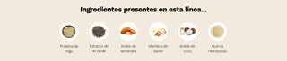 Jugo de aloe, extracto de camomila, Aceite de almendra, Extracto de té verde, aceite de canela, jugo de jengibre, Extracto de Jengibre, Proteína de Trigo, Aceite de Ricino, Vitamina E, Aceite del Salvado de Arroz, Aceite de Jojoba, extracto de granada, extracto de almendra, manteca de karité, aceite de argán, aceite de acai, proteína de arroz, aceite de aguacate, aceite de coco, quinoa hidrolizada, almidón de maíz.