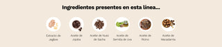 Aceite de Jengibre, aceite de coco, aceite de ricino, aceite de nuez de sacha, aceite de semilla de uva, aceite de macadamia.