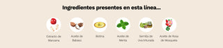 Extracto de jengibre, extracto de manzana, té verde, aceite de hoja de menta, aceite de nuez , aceite de babasú, piritiona de zinc, Jugo de aloe vera, aceite de árbol de té, biotina, niacinamida, manteca de karité, semilla de uva triturada, aceite de moringa, aceite de rosa de mosqueta, extracto de jengibre, aceite de cáscara de naranja, aceite de eucalipto, extracto de menta, extracto de romero, ácido salicílico.