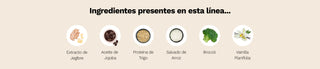 Extracto de Jengibre, Aceite de Jojoba, Vainilla Planifolia, Aceite del Salvado de Arroz, extracto de brócoli.